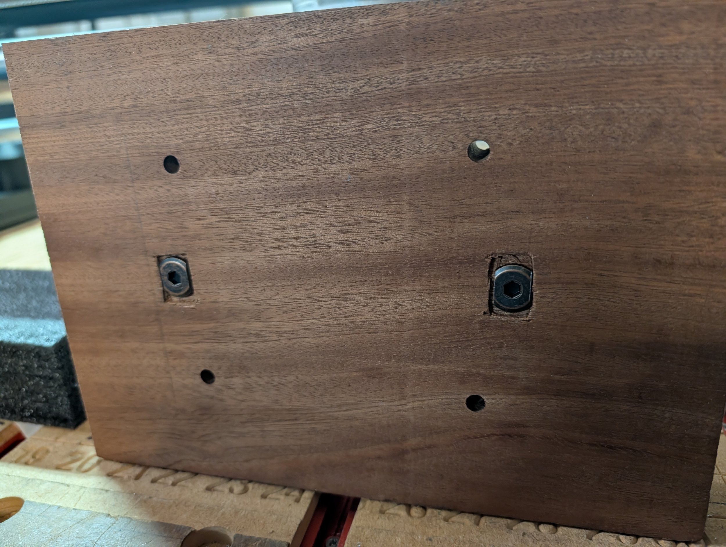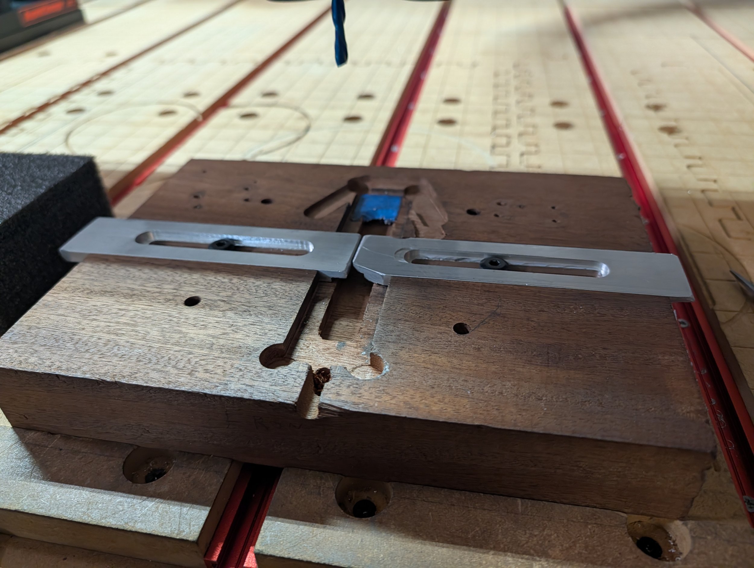 You can also use these clamps to make your fixtures even more useful by installing them in your fixture just drill a hole for a press fit for a Beefy T nut through you fixture and carve out a slot in the bottom of your fixture as shown below in our example. For the ultimate in repeatability for those ongoing Jobs, making them far easier to do multiples of the same product. Making life much easier and improving your workflow as well. use in conjunction with locator pins it make repeatable setups virtually quick and painless. You can see the four holes for the locator pins add them to your work program